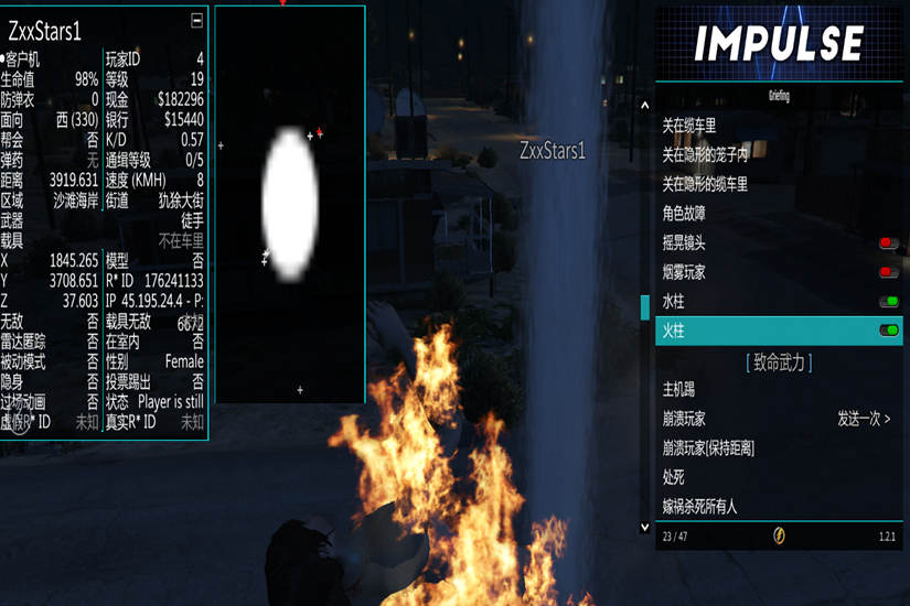 强大又多元的恶搞功能,快速战局追踪、崩溃玩家游戏、踢出玩家、套模型、喷水喷火、关在笼子里、强制该玩家传送、让他的载具熄火、全局崩溃及恶搞、降低FPS、NPC攻击.....制霸战局的神器,您就是战局的管理员,一切尽在您的掌握,一个按键马上生效!