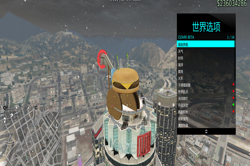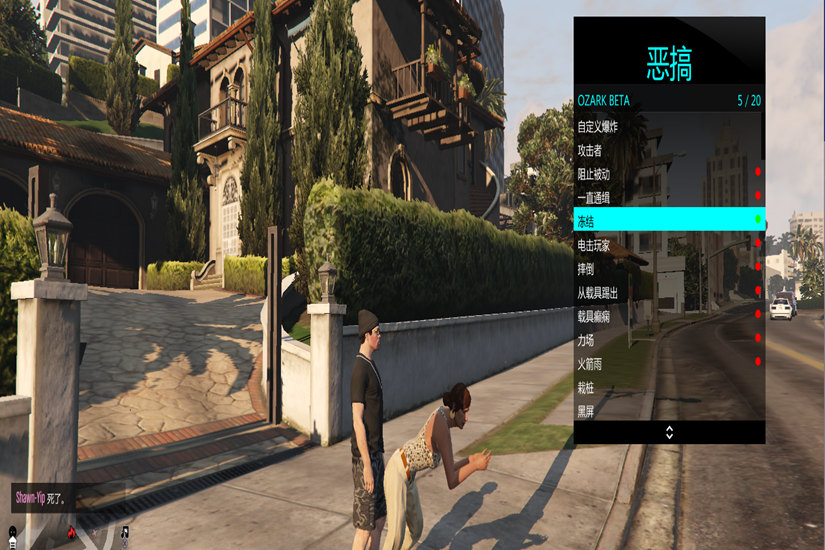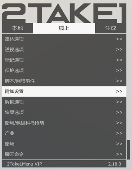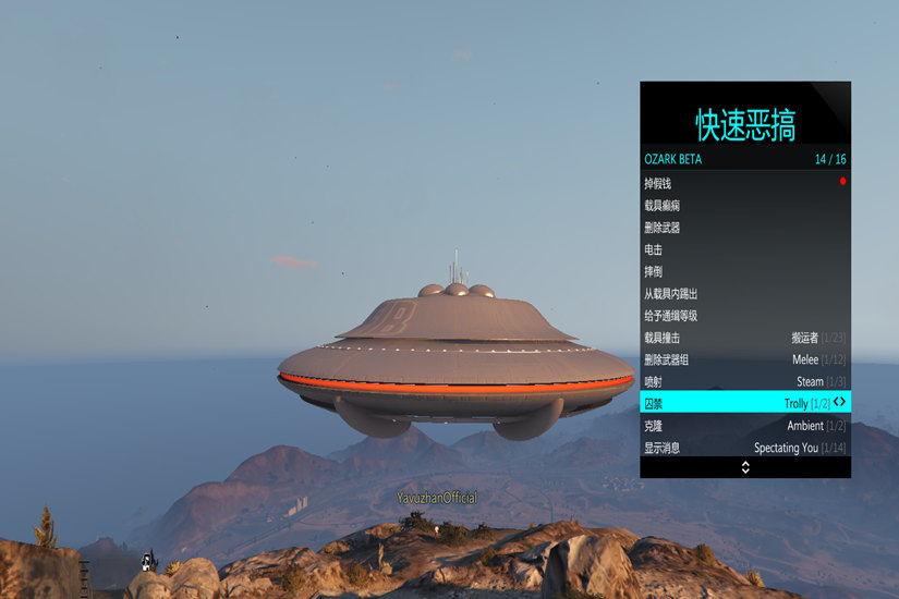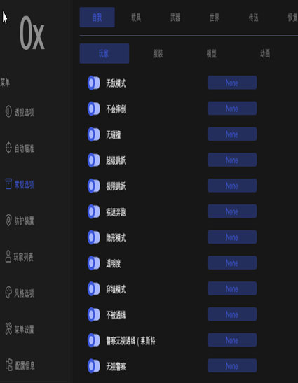 无敌、瞬移、刷出载具、刷出武器、走在空中、克隆保镖、移除障碍碰撞、水上行走、隐形、雷达隐形、超人模式、杀死附加NPC 、夜视、热视觉、角色变小、消除警星、防止被别的辅助搞功能、崩溃任意玩家让他游戏关闭、空袭任意玩家、战局全部人循环轰炸、踢出任意玩家、套模型套UFO等、改变天气、改变时间、改变角色模型、服装、载具无敌、远程时间选项、全战局黑屏、 踢出所有CEO、全部玩家崩溃、全部踢出战局、全部踢出载具、假现金全部删除、全部交易错误提示。等几百种功能。